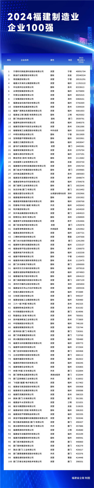 11月8日,2024福建企业100强发布大会召开会上发布了2024福建企业100强、2024福建制造业企业100强、2024福建服务业企业100强、2024福建战略新兴产业企业100强。四份名单一起来看——