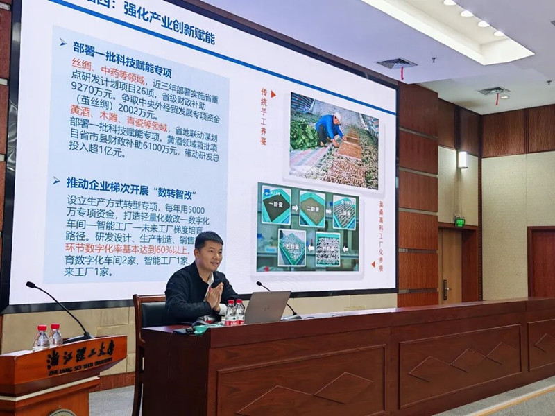 浙江理工大学校长陈文兴以《守护丝绸产业,传承中华文明》为题,开展专题解读,从历史文化、加工工艺、产业格局、科技创新四大维度,系统阐释产业价值与发展路径。陈校长追溯丝绸与天然纤维的文明起源及考古实证,通过“蚕、茧、丝、帛”等汉字演变、经典成语及上古传说,具象呈现丝绸文化与中华文明的深度交融,详解缫丝、织造至服装生产全链条工艺,梳理世界丝绸产业中心变迁。聚焦丝绸产业科技创新,他介绍了丝绸原料获取突破、缫丝智能化绿色化转型、纱线工艺革新以及人工智能赋能设计、蚕丝健康材料研发进展,强调教育体系构建与人才培养的重要性,为产业高质量发展、传承中华优秀传统文化提供有力支撑。