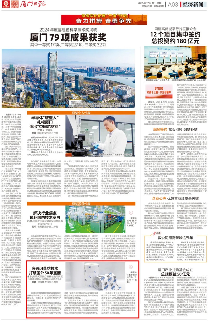 近日,2024年度福建省科学技术奖正式揭晓。由厦门当盛新材料有限公司、大博医疗科技股份有限公司及厦门大学共同完成的 “最终灭菌医疗器械包装用闪蒸法纤维屏障材料关键技术及产业化” 项目,成功斩获福建省科技进步二等奖。该项产学研合作的重要成果,获得了《厦门日报》等权威媒体的重点关注与报道。