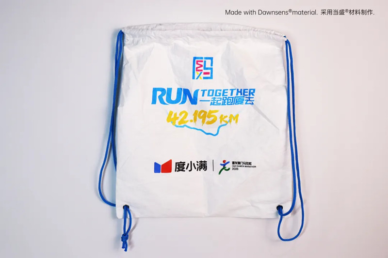 这份备受跑者青睐的完赛包,藏着太多环保黑科技。它采用100%高密度聚乙烯通过闪蒸法工艺制成,由微米级超细纤维交织成立体网状结构,兼具纸张的挺括、织物的柔软与薄膜的防水特性。跑者们不难发现,完赛包看似轻盈,却有着极强的抗撕裂强度,即便装入奖牌、补给等物品也不易破损;同时具备优异的防水透气性能,哪怕遇到阴雨天气,也能妥善保护包内物品。